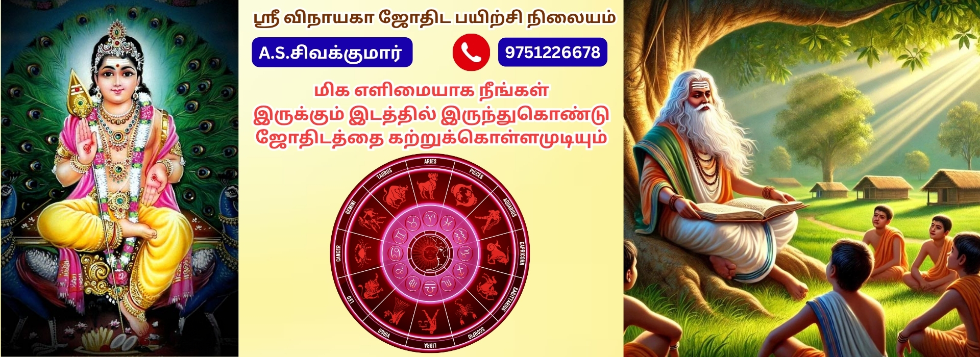 மிக எளிமையான முறையில் அனைவரும் கற்று கொள்ளும் வகையில் ஜோதிட பயிற்சி வகுப்பு எளிமையாக புரியும்படி இருக்கும் ஆர்வம் உள்ள அனைவரும் கற்று கொள்ளலாம் ஆணாக இருந்தாலும் பெண்ணாக இருந்தாலும் வீட்டிலிருந்தபடியே இந்த ஜோதிடக் கலையை முழுமையாக கற்றுக்கொள்ள ஒரு அற்புதமான வாய்ப்பு ஜோதிடத்தில் ஆர்வம் கொண்டு, இந்த மையத்தில் ஜோதிடம் பயின்று, ஏராளமானஅன்பர்கள், தங்களது உற்றார் உறவினர்களுக்கும் நண்பர்களுக்கும் மிகச்சிறப்பாக ஜோதிட ஆலோசனைகளை வழங்கி வருகின்றனர்